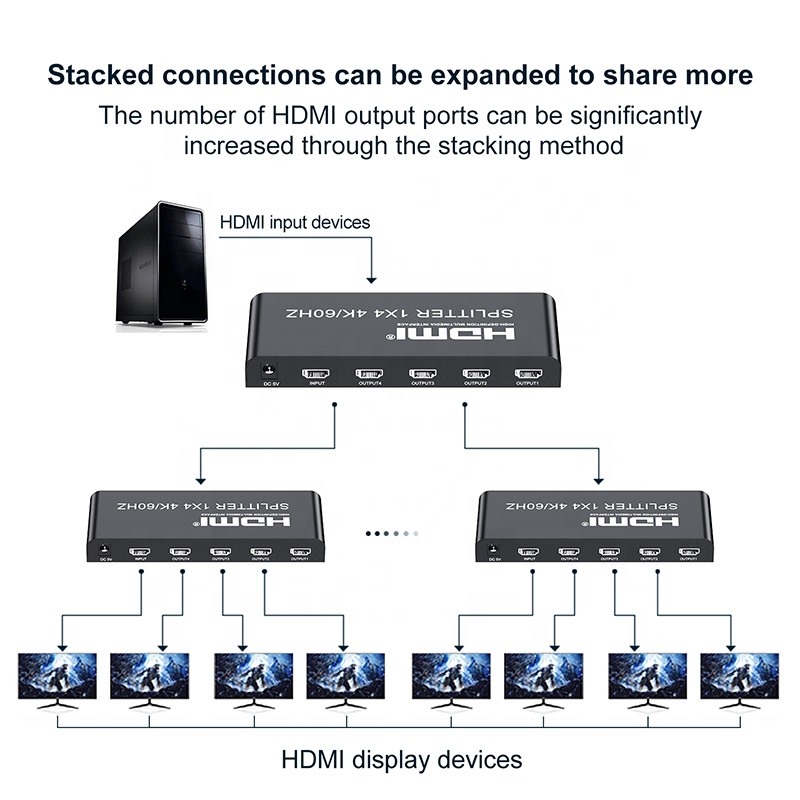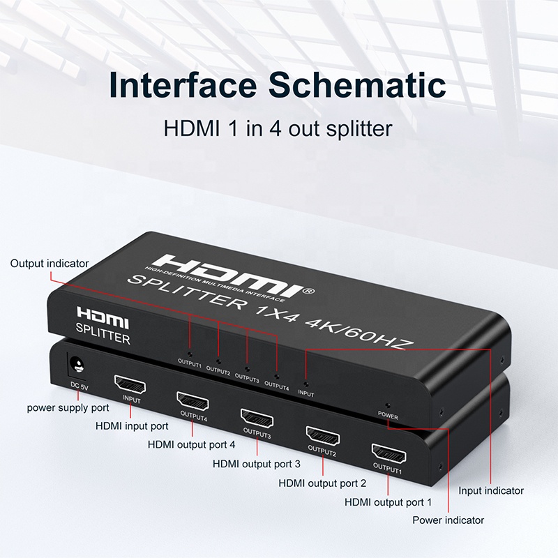 MT-SP104 4K HDMI splitter. Easily mirror a single high-definition video source to 4 separate screens at once without any loss of quality.